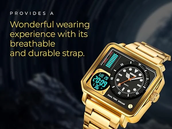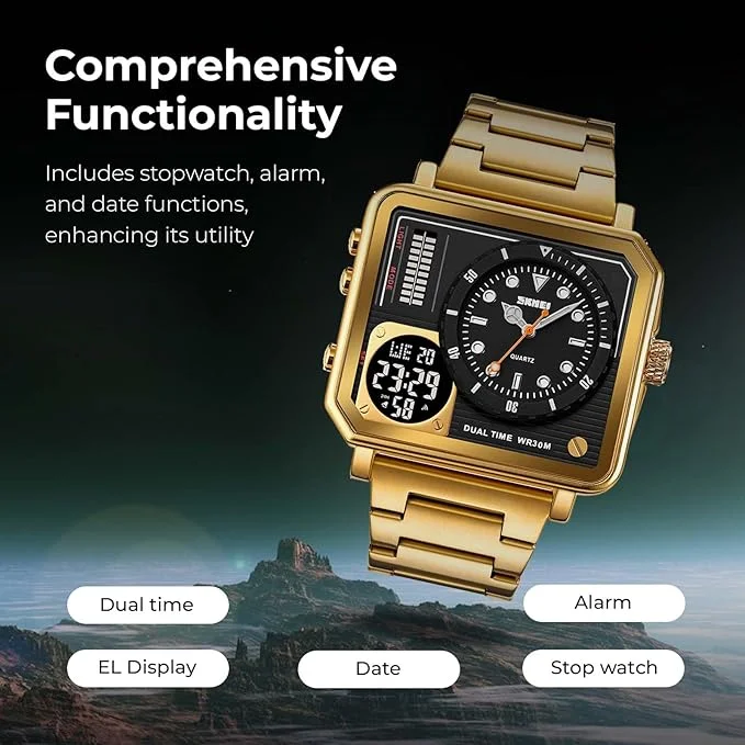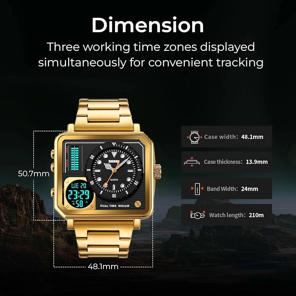 SKMEI – 2025 – LED Backlight Large Screen Multi-Time Zone Waterproof Watch – Golden